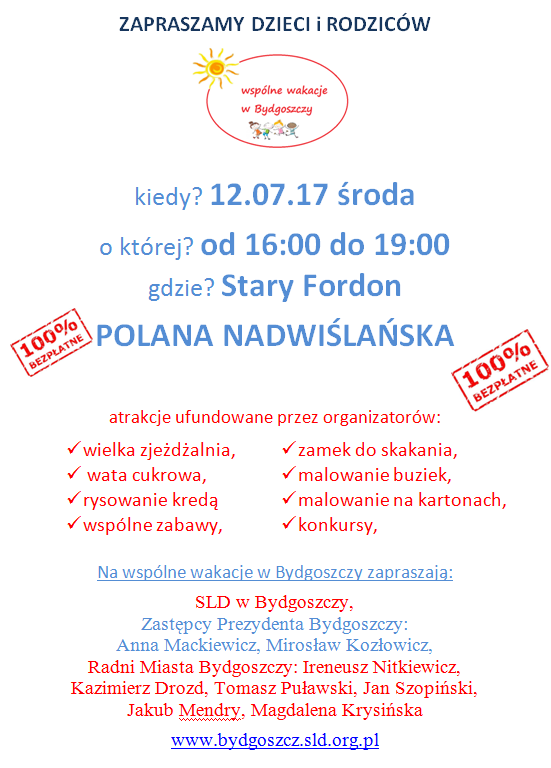 Wzorem ubiegłego roku samorządowcy lewicy w Bydgoszczy zapraszają na festyny rodzinne pod nazwą Wspólne wakacje. Na wszystkich uczestników czeka mnóstwo darmowych atrakcji. Pierwsze dwie imprezy plenerowe już w najbliższy wtorek i środę.